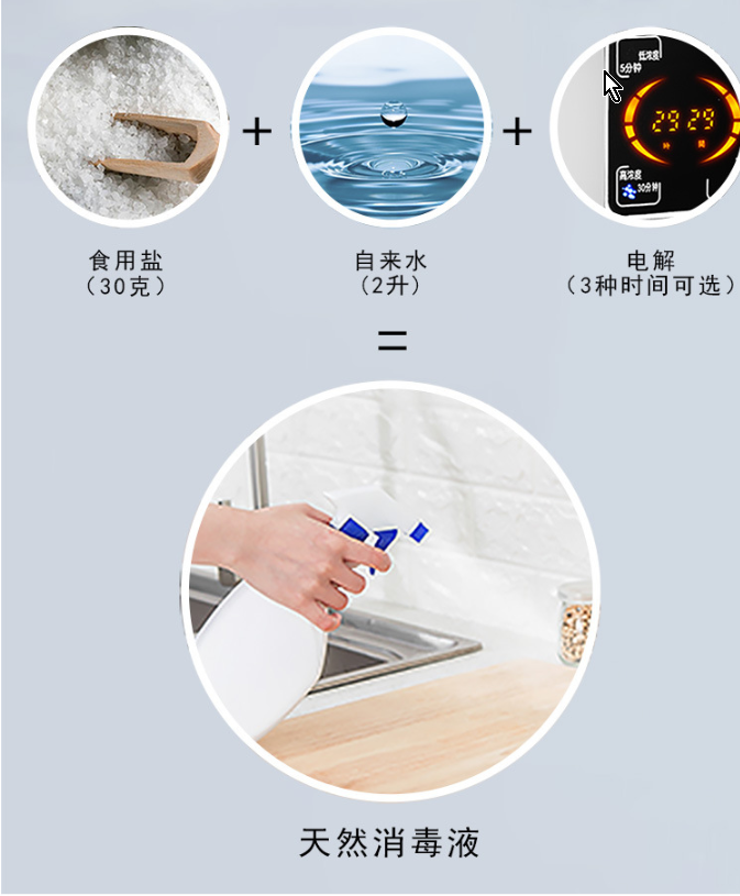 家用食鹽 + 自來水 ,自已的消毒水自已作,不用排隊,要作多少有多少。